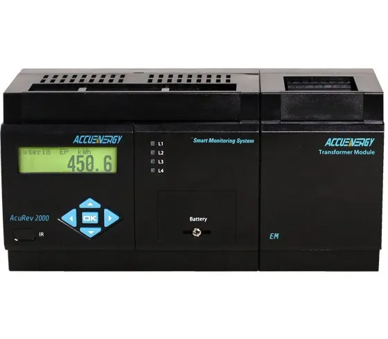 The AcuRev 2000 Series is the next generation multifunction energy meter developed and manufactured by Accuenergy. It performs real-time metering, measures energy consumption and monitors power quality for up to 18 single phase circuits (or 6 three phase circuits) in one unit.