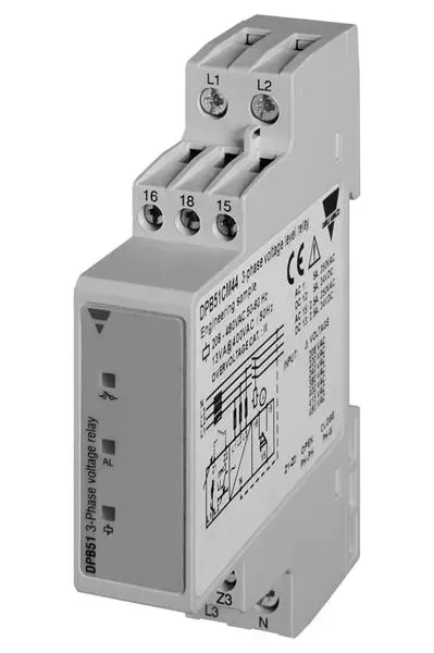 Carlo Gavazzi's DPB51CM44B006 is a three-phase over and under voltage monitoring relay that measures partial phase loss, neutral loss and it's own power supply input. The relay has 2 adjustable setpoints and an an adjustable time delay switch.