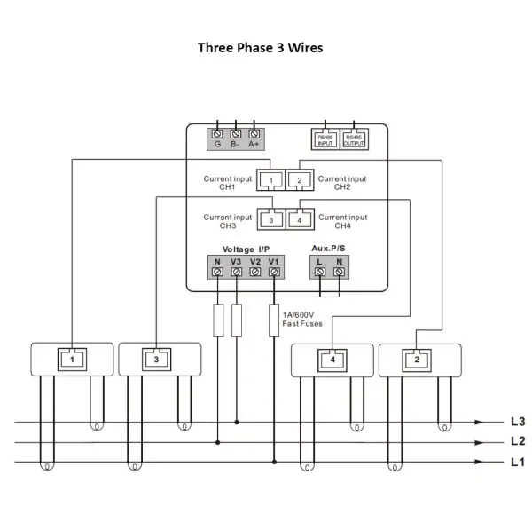 The SDM630MCT-1L measures either 3 x single phase circuits or 1 x three phase circuit via 100mA Easyclick current transformers (RJ12 connection).