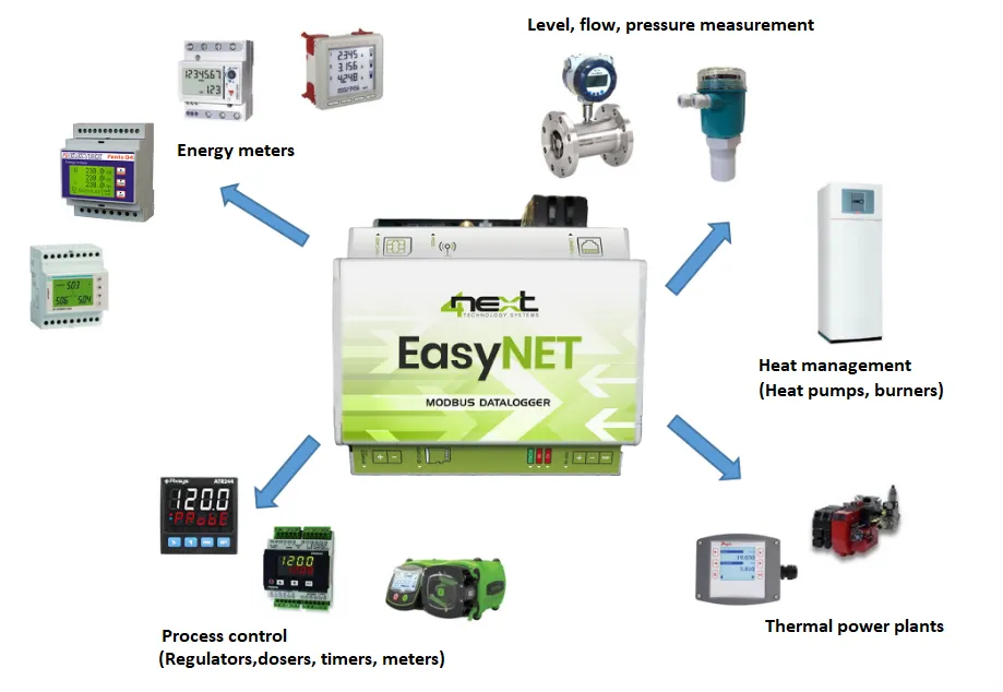 EasyNET is a datalogger with EasyLog software functions that allows for interfacing with all ModBus RTU and TCP devices in a simple way without knowing how to program.