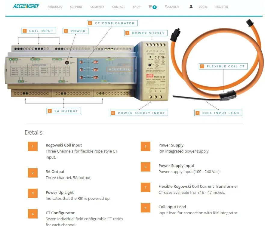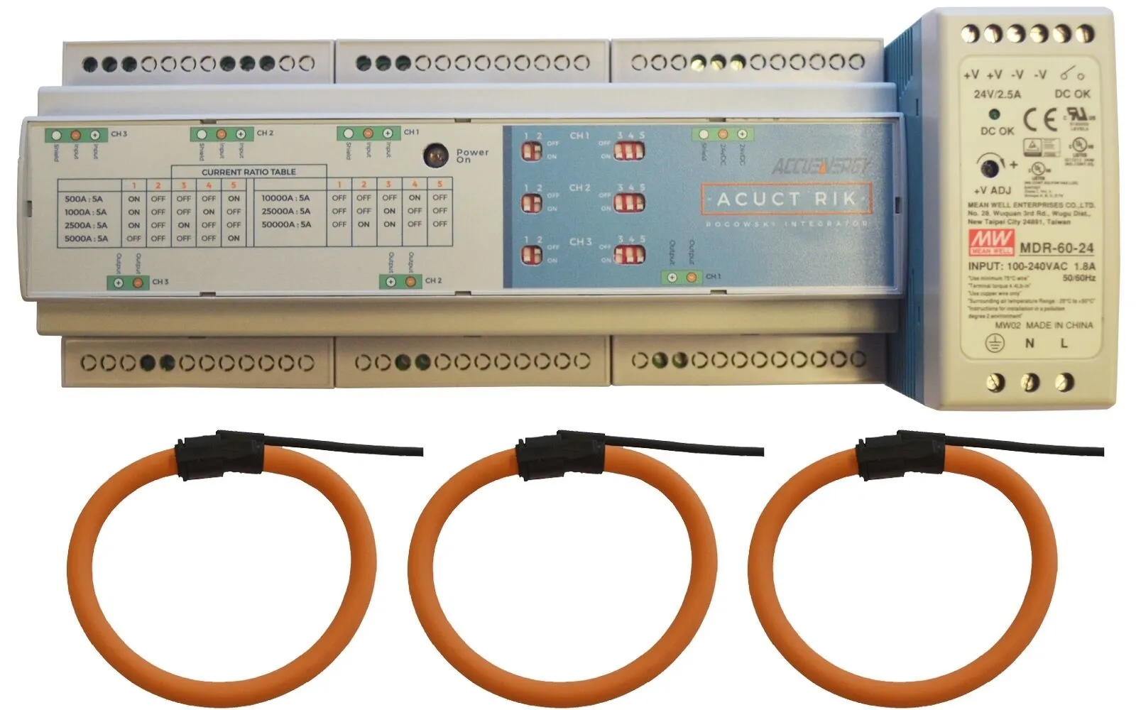 The Accuenergy Rogowski Integrator Kit (RIK) provides users with an easy-to-install, plug-n-play solution to be used with any power meters or equipment with a 5A current transformer input. Meaning the RIK will allow for the installation of Rogowski coil CTs in a variety of applications/configurations where spacial constraints may limit the use of other CT solutions. The RIK kit is designed around a three-channel 5A output integrator and includes with it: three Accuenergy Rogowski coil current sensors, and one power supply. All of these parts are further configurable for the needs of many applications.
