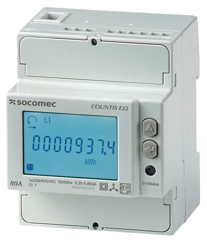 Socomec's COUNTIS E21 is a modular active electrical energy meter displaying the energy and power consumed (kWh and kW) directly on its back-lit LCD display. It is designed for three-phase load metering and is used for direct connections of up to 80 A.