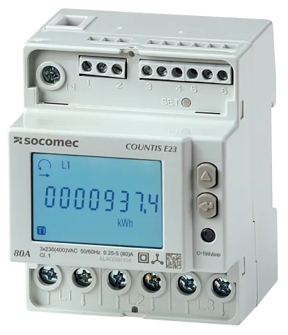 Socomec's COUNTIS E23 is a modular active electrical energy meter displaying the energy and power consumed (kWh and kW) directly on its back-lit LCD display. It is designed for three-phase load metering and is used for direct connections of up to 80 A.