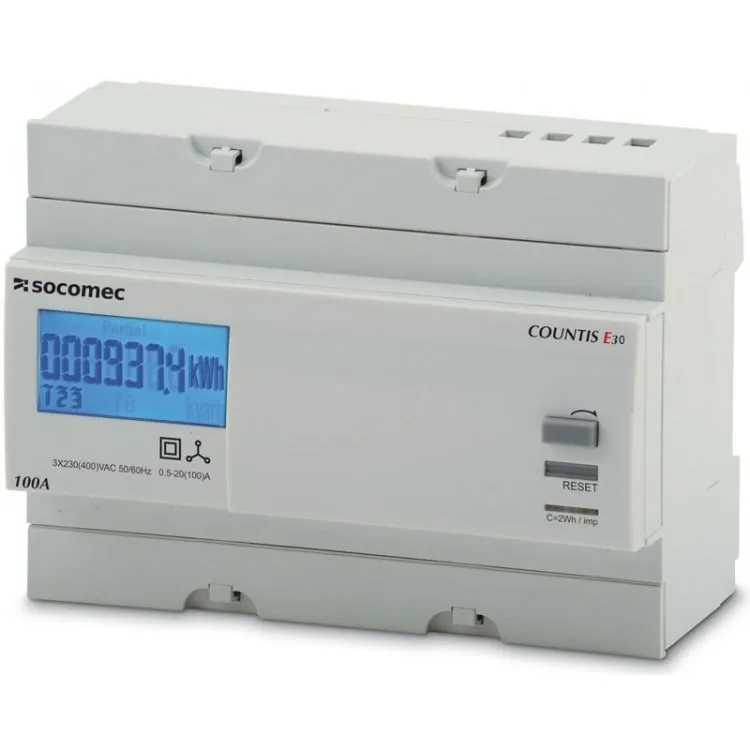 Socomec's COUNTIS E30 is a modular active electrical energy meter displaying the energy and power consumed (kWh and kW) directly on its backlit LCD display. It is designed for three-phase load metering and is used for direct connections of up to 100 A.