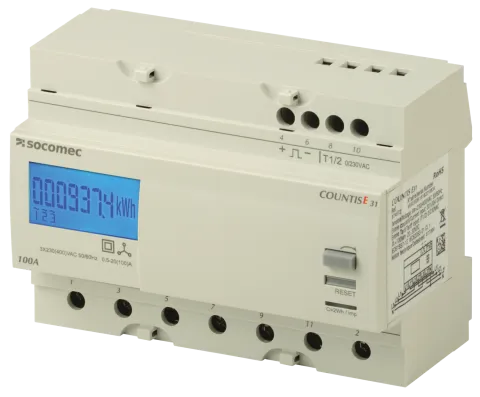 Socomec's COUNTIS E31 is a modular active electrical energy meter displaying the energy and power consumed (kWh and kW) directly on its backlit LCD display. It is designed for three-phase load metering and is used for direct connections of up to 100 A.