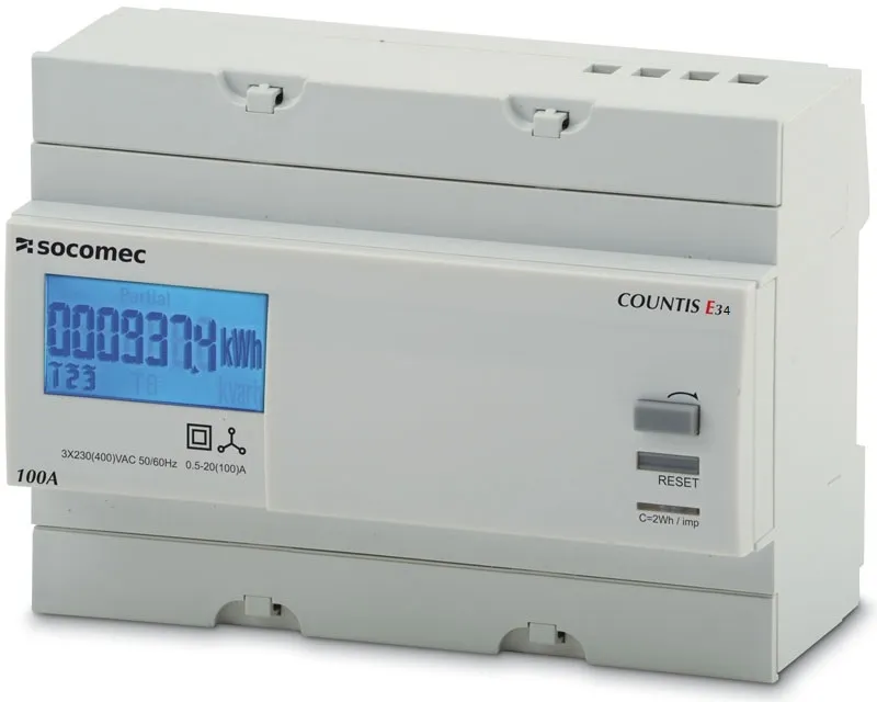Socomec's COUNTIS E34 is a modular active electrical energy meter displaying the energy and power consumed (kWh and kW) directly on its backlit LCD display. It is designed for three-phase load metering and is used for direct connections of up to 100 A.