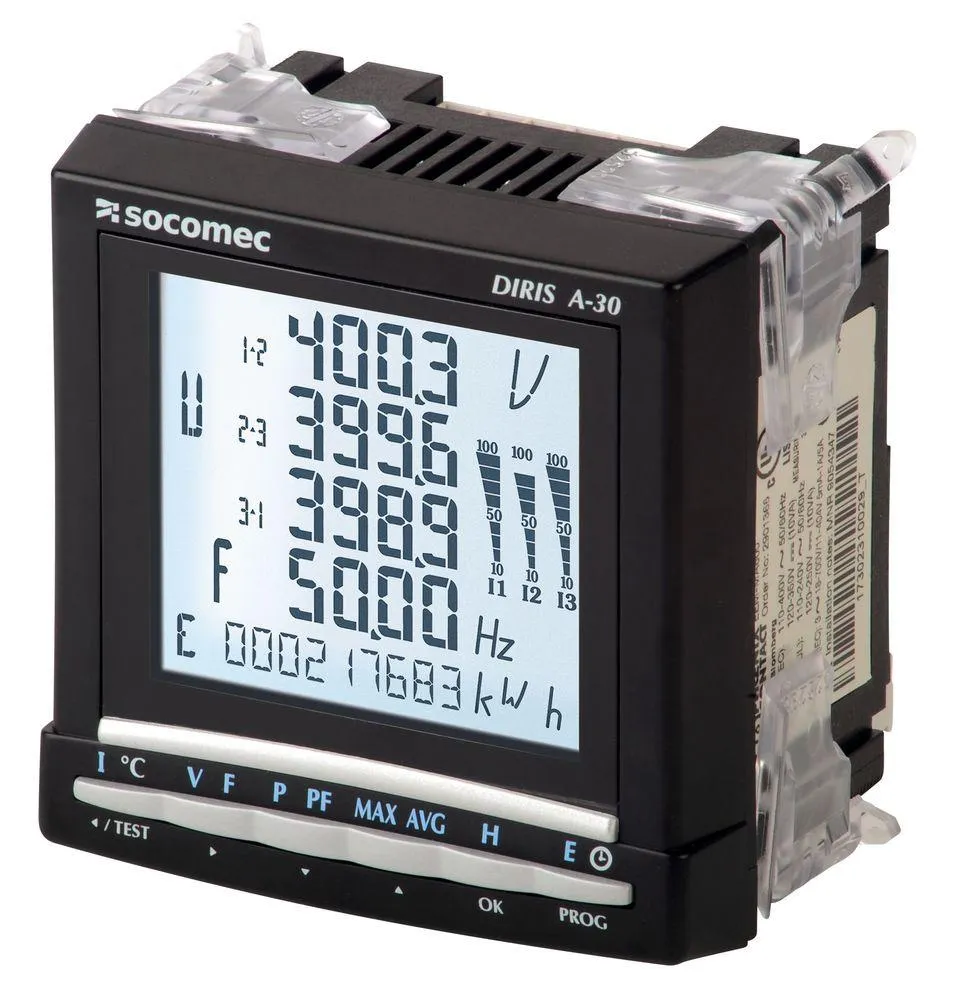 Socomec's DIRIS A-30 is a high-performance metering and monitoring device ideal for energy efficiency and monitoring. This meter features a correction function for TC wiring errors, and a large back-lit multiple-display screen for user-friendly operations.