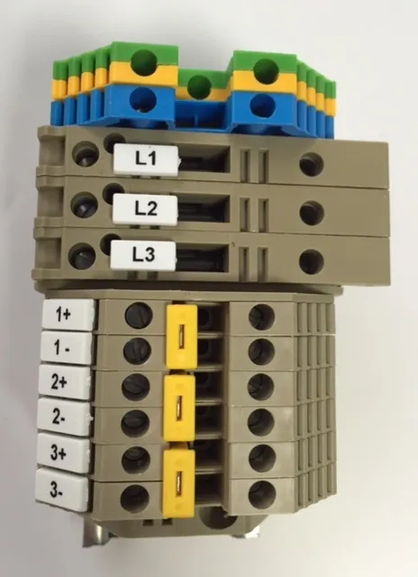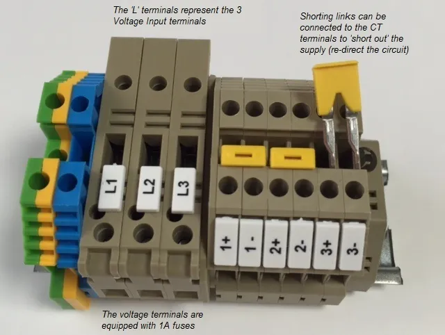 Bespoke 3-Phase Terminal Rail provides reference for Voltage and CT inputs of the meter connected via screw terminals. The Voltage connections have fuses implemented and the CT connections have shorting links, allowing for easy replacement of the meter without shutting down the supply.